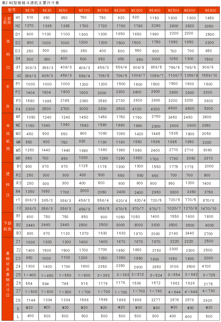 NE series board chain bucket elevator overall and mounting dimensions B> FONT> P>