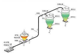 本系统一般采用罗茨鼓风机作为气源,旋转供料器、喷射器等作为供料装置,物料经供料装置进入输送管道,与高速气力混合后输送到末端收料仓,通过料气分离装置过滤后的气体排入大气;适合输送距离较短(300米以内)、 物料磨损性小、多个收料仓的工程。